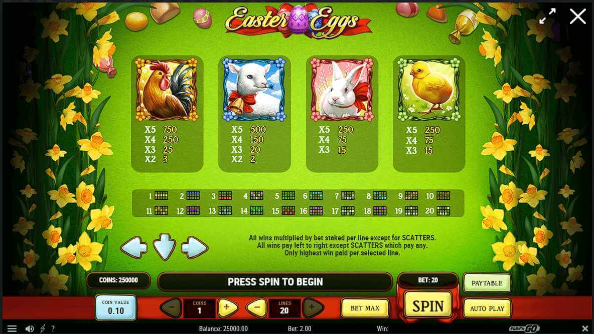 The free spins round is triggered by landing three or more egg scatters. The egg bonus round is launched by landing three basket bonus symbols.