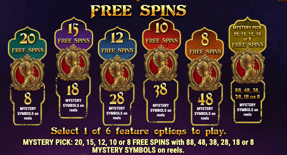Before the bonus round starts, you can select the number of free spins and mystery symbols you’d like to receive. There are six options to choose from: